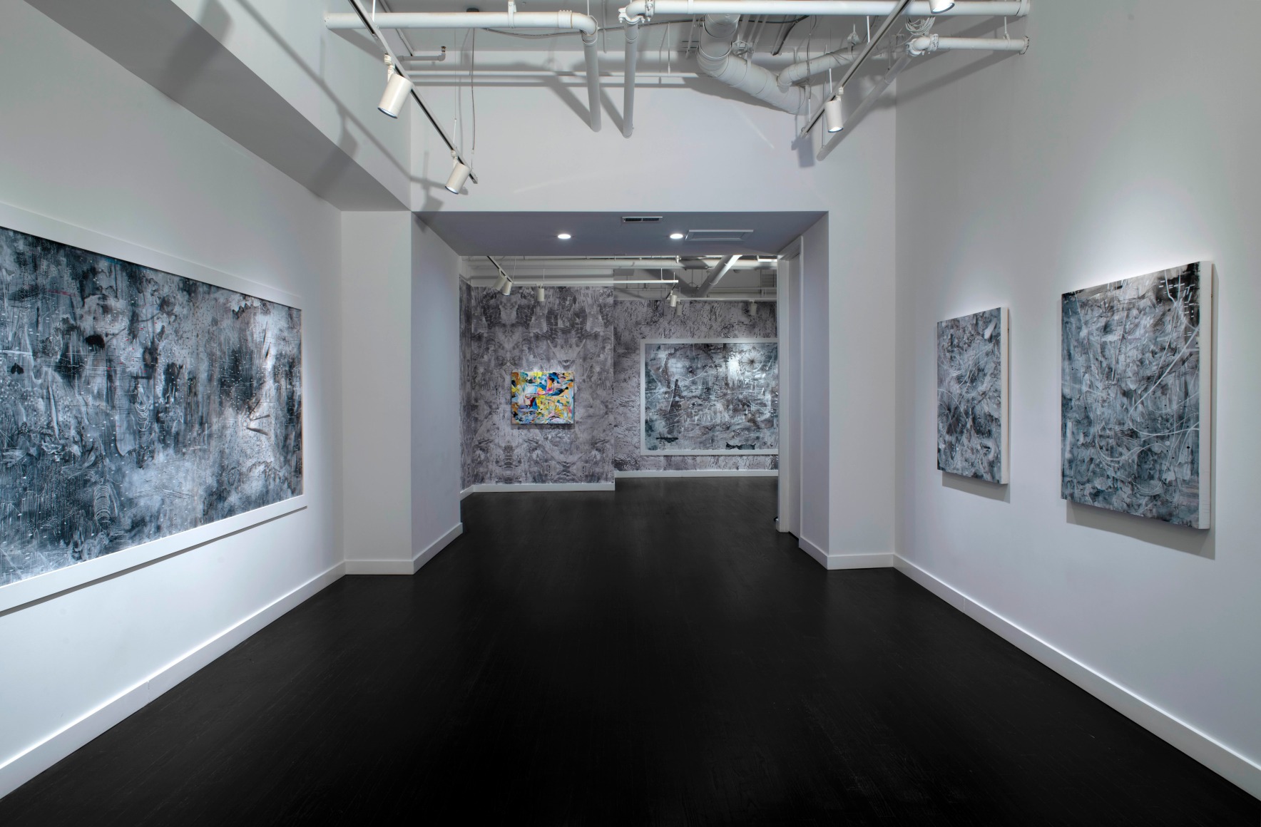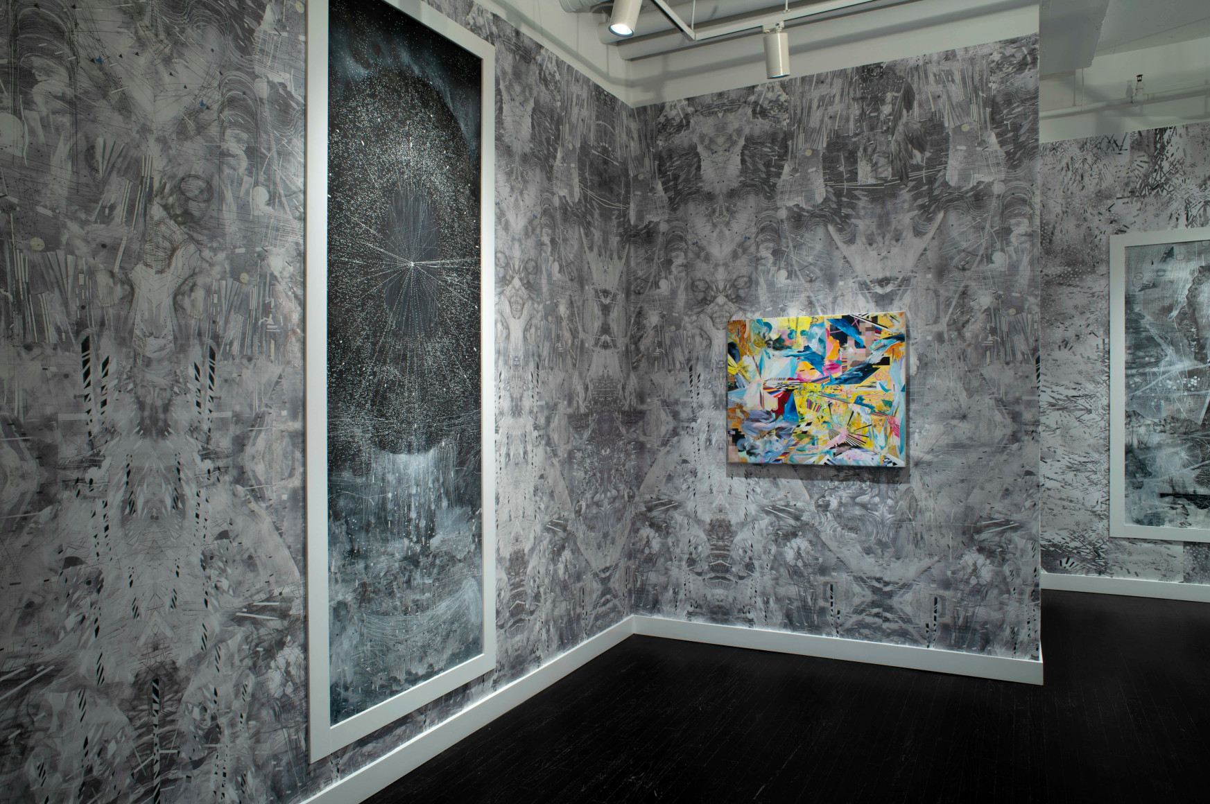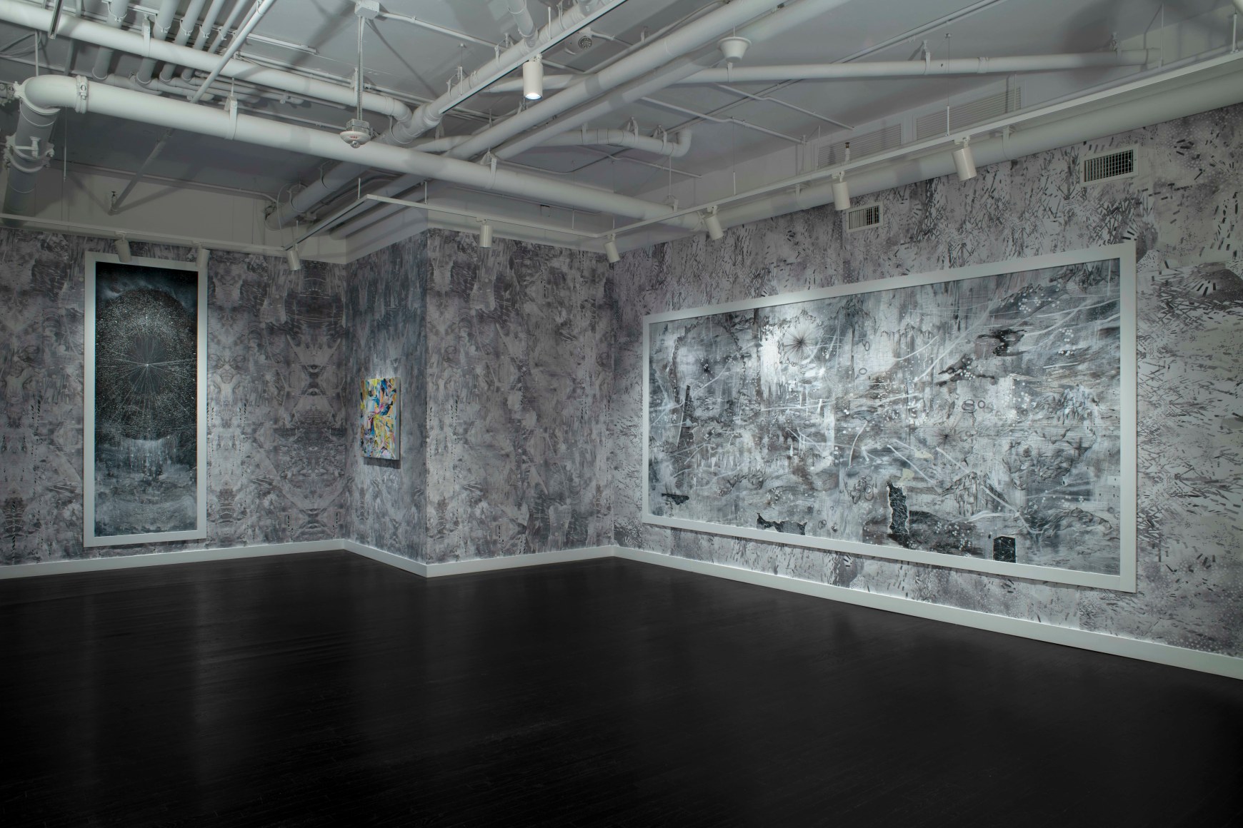 Like the imaginary maps at the beginning of fantasy novels, Amy Schissel’s world building is vast. Wherever one’s eyes wander, they wander in wonder, resting upon a detail that instantly leads into luminous, ever-expanding, continuous, and promising space. The large-scale drawings combine traditional cartography, illustrated topographical mountains, and cyber mapping systems to create vigorous artworks that span space, time and universes. The painting and drawing processes record physical and fictional journeys of the artist through spaces, imagined and real. The monumental scale and intricate details of Schissel’s drawings invite the viewer into her process. Thousands of repetitive marks show the artists’ hand, drawing out expeditions in a never-ending, fantastical atlas. Whether hypnotized by the soft auras of color amidst primarily black and white surfaces, or the swirling white mist, Amy Schissel keeps us in the palm of her hand as we enter her multiverse.