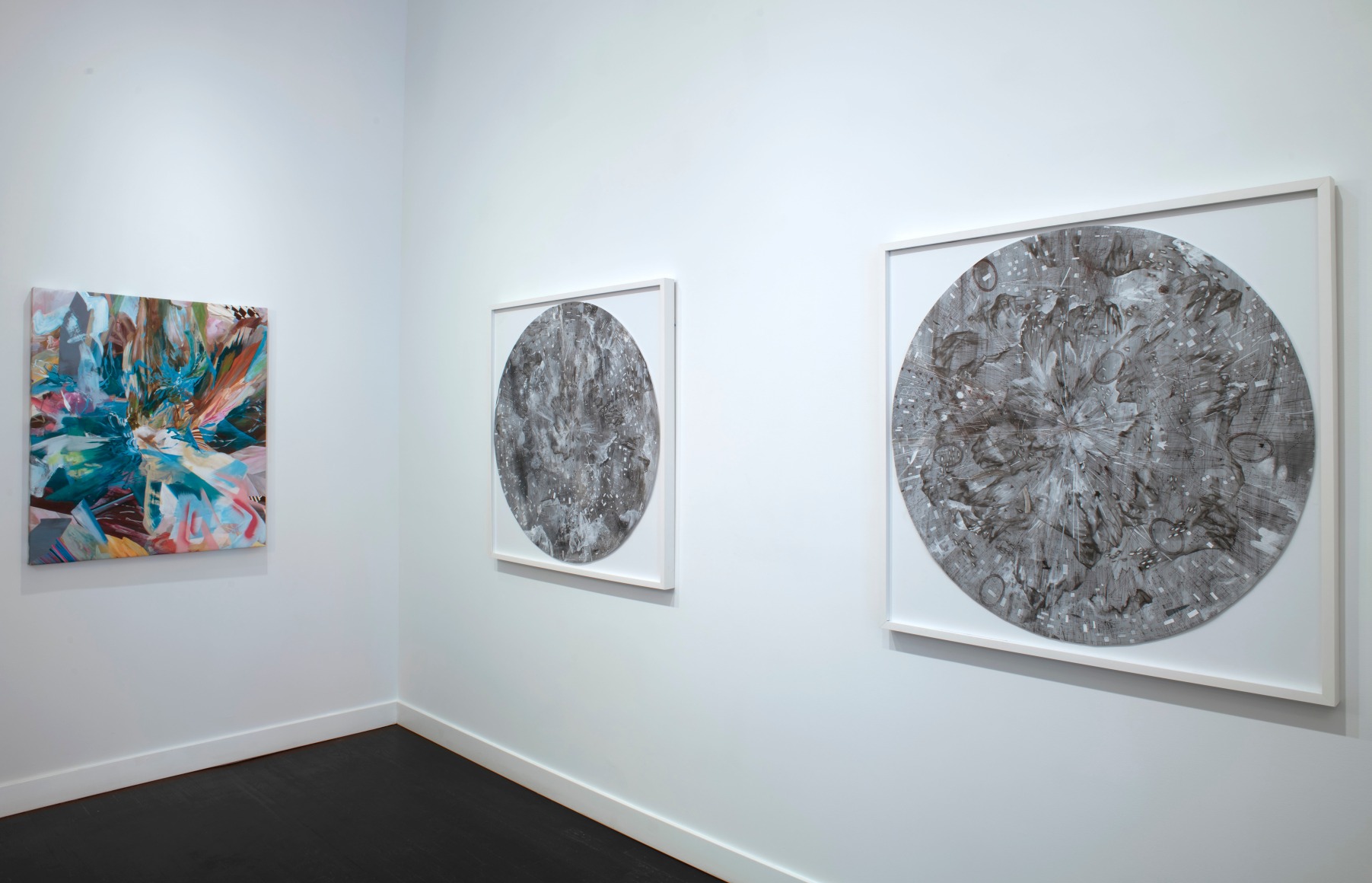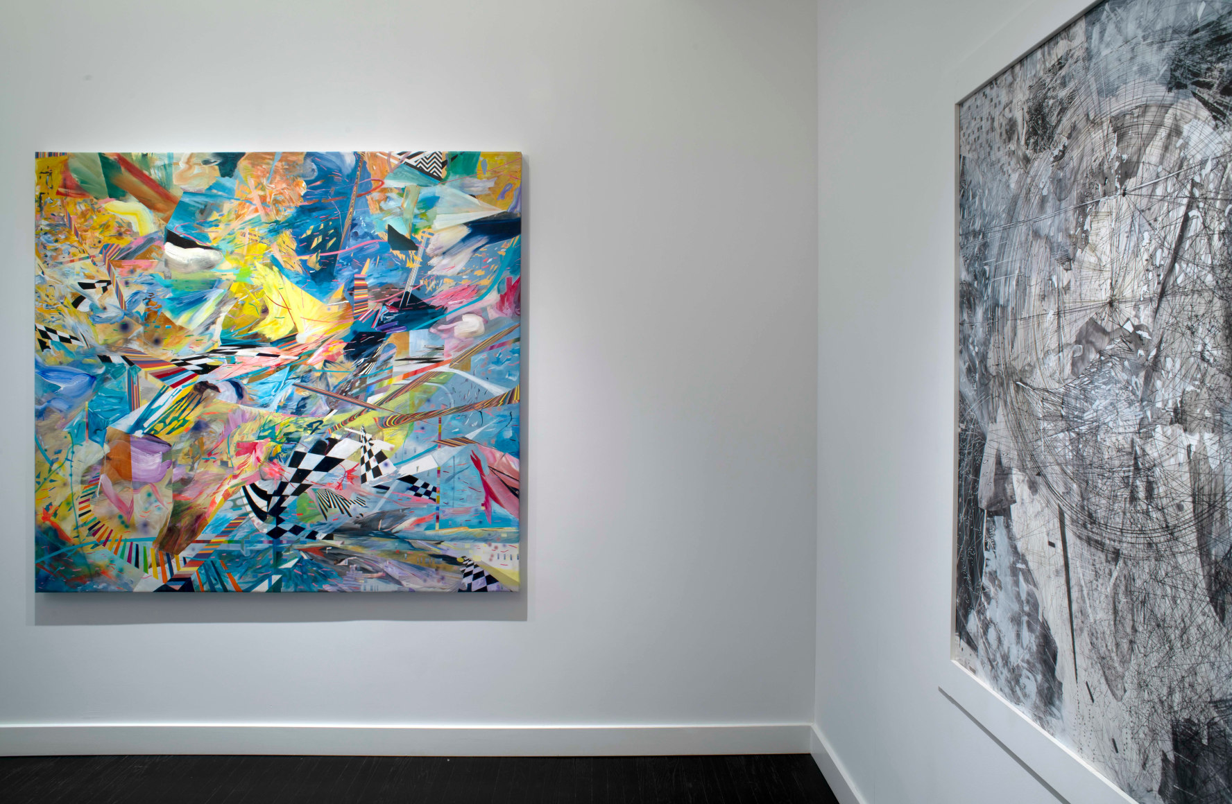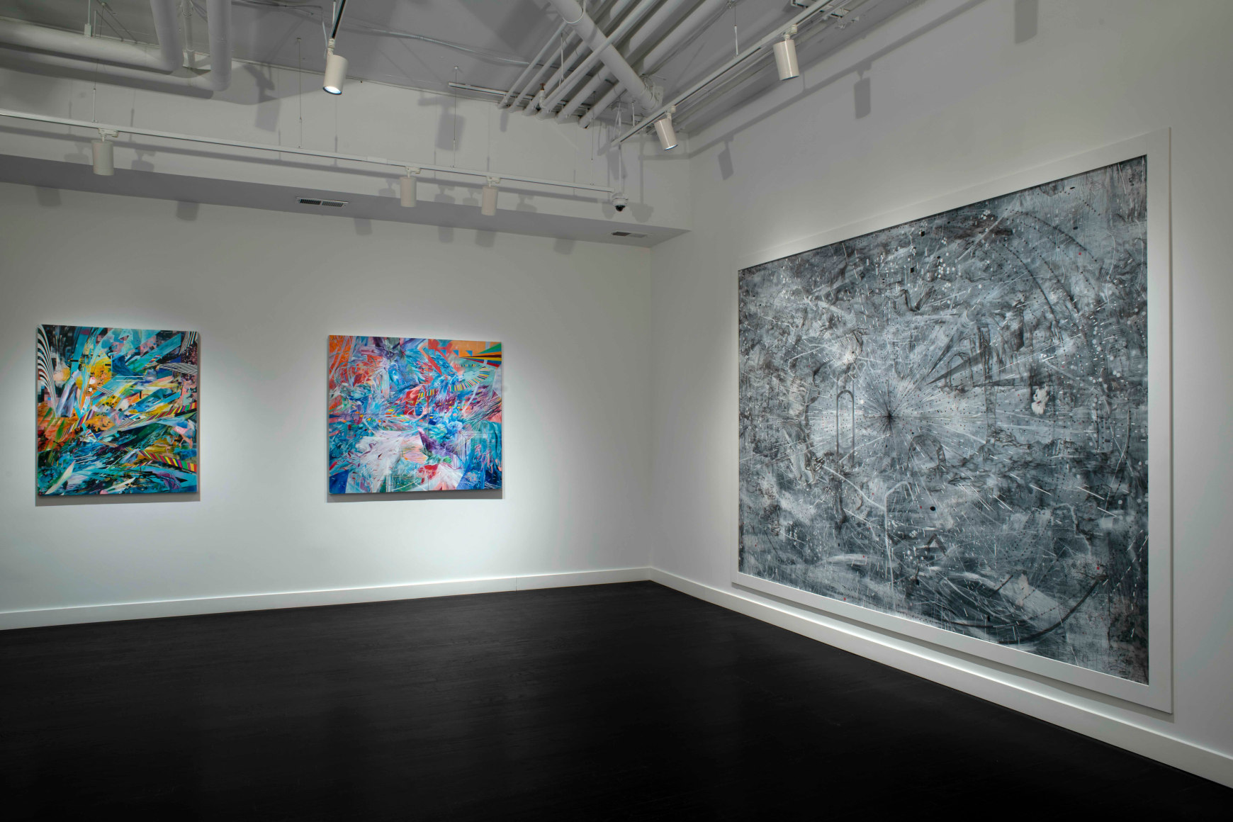 Like the imaginary maps at the beginning of fantasy novels, Amy Schissel’s world building is vast. Wherever one’s eyes wander, they wander in wonder, resting upon a detail that instantly leads into luminous, ever-expanding, continuous, and promising space. The large-scale drawings combine traditional cartography, illustrated topographical mountains, and cyber mapping systems to create vigorous artworks that span space, time and universes. The painting and drawing processes record physical and fictional journeys of the artist through spaces, imagined and real. The monumental scale and intricate details of Schissel’s drawings invite the viewer into her process. Thousands of repetitive marks show the artists’ hand, drawing out expeditions in a never-ending, fantastical atlas. Whether hypnotized by the soft auras of color amidst primarily black and white surfaces, or the swirling white mist, Amy Schissel keeps us in the palm of her hand as we enter her multiverse.