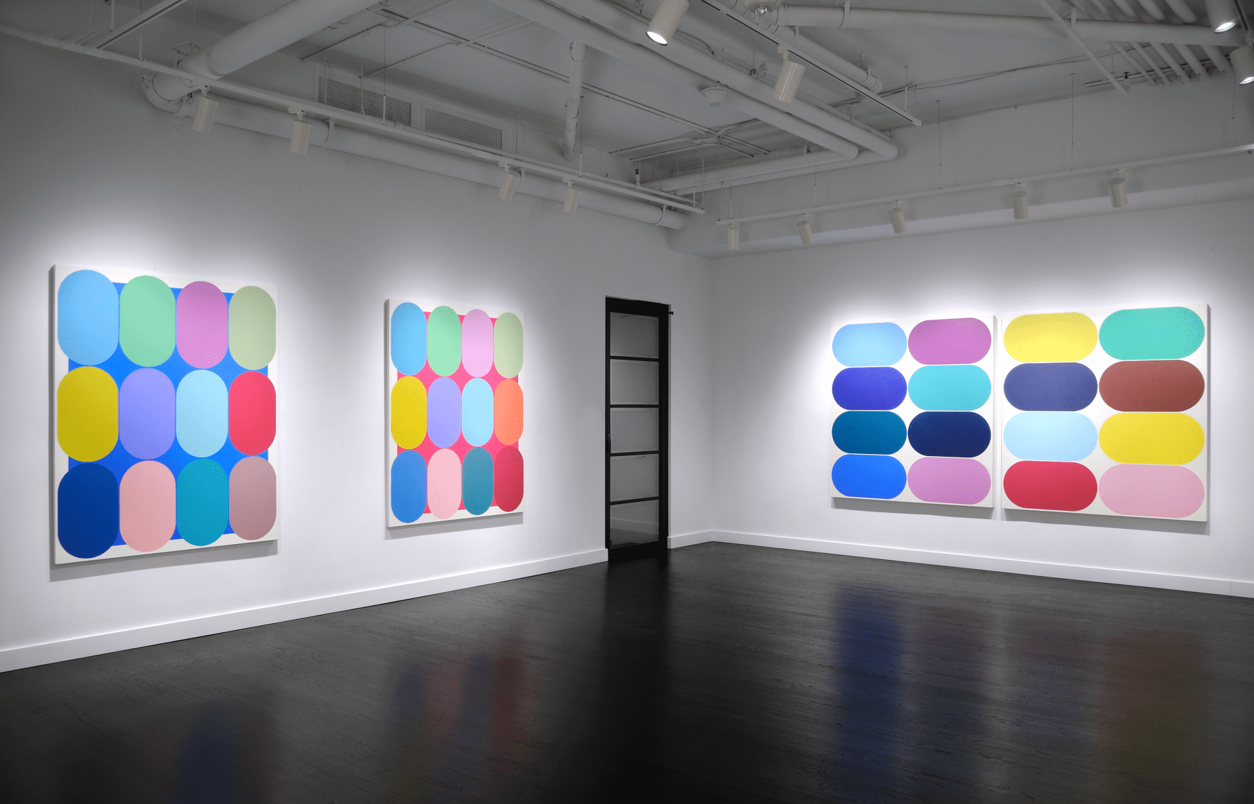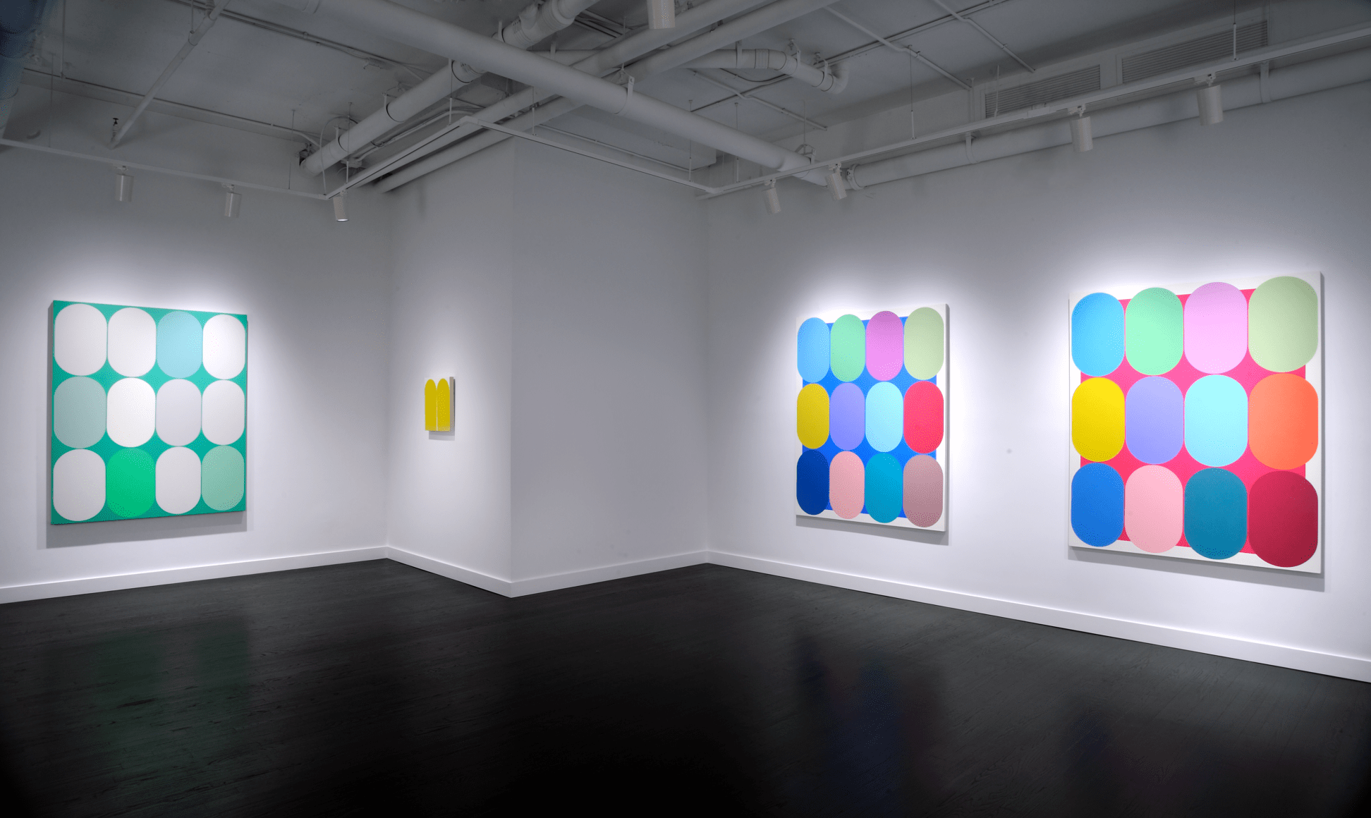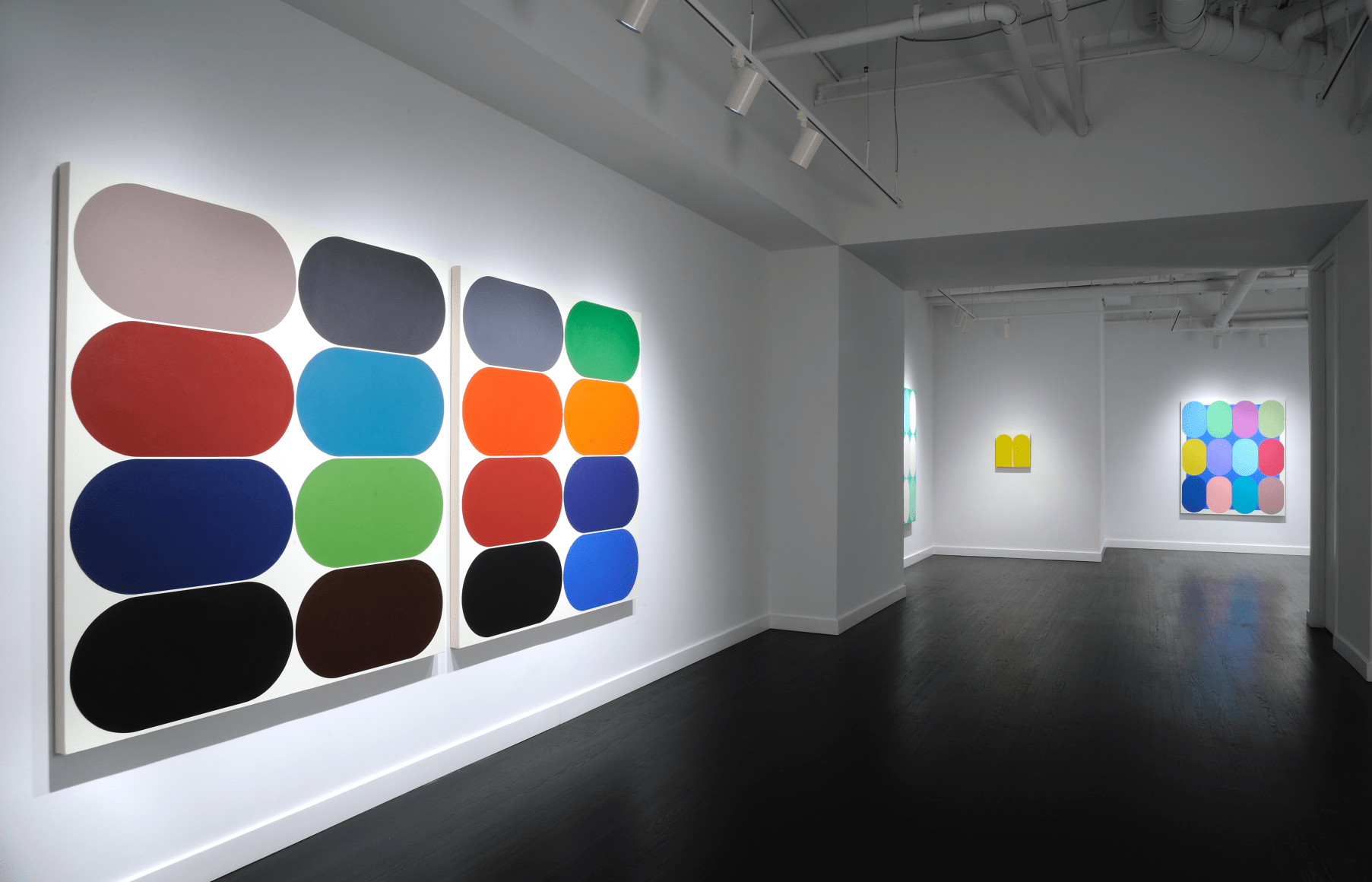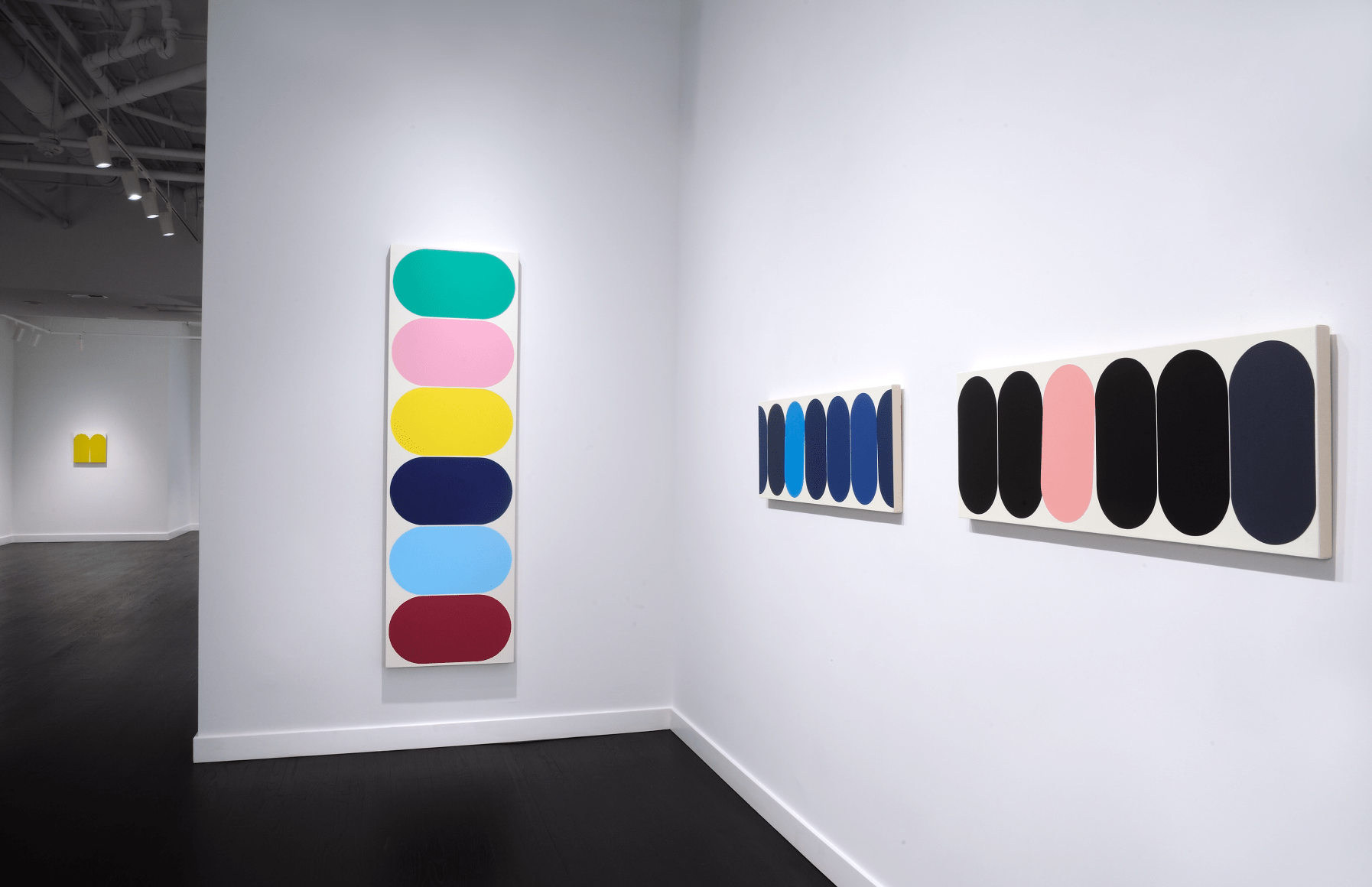 Yi presents a basic unit or form inspired by daily life, urban space, and the natural landscape. The Eq. or Equilibrium Series explores the function of a single defined shape, deployed by the artist in marching arrangements where a grid of like forms is punctuated by contrasting colors. Yi has described this shape as a racetrack, and it appears as a capsule, neither flat nor three-dimensional. The elongated oval creates a sense of speed, suggesting an entity in constant motion, circles straining against their borders to fill all available space on the canvas.