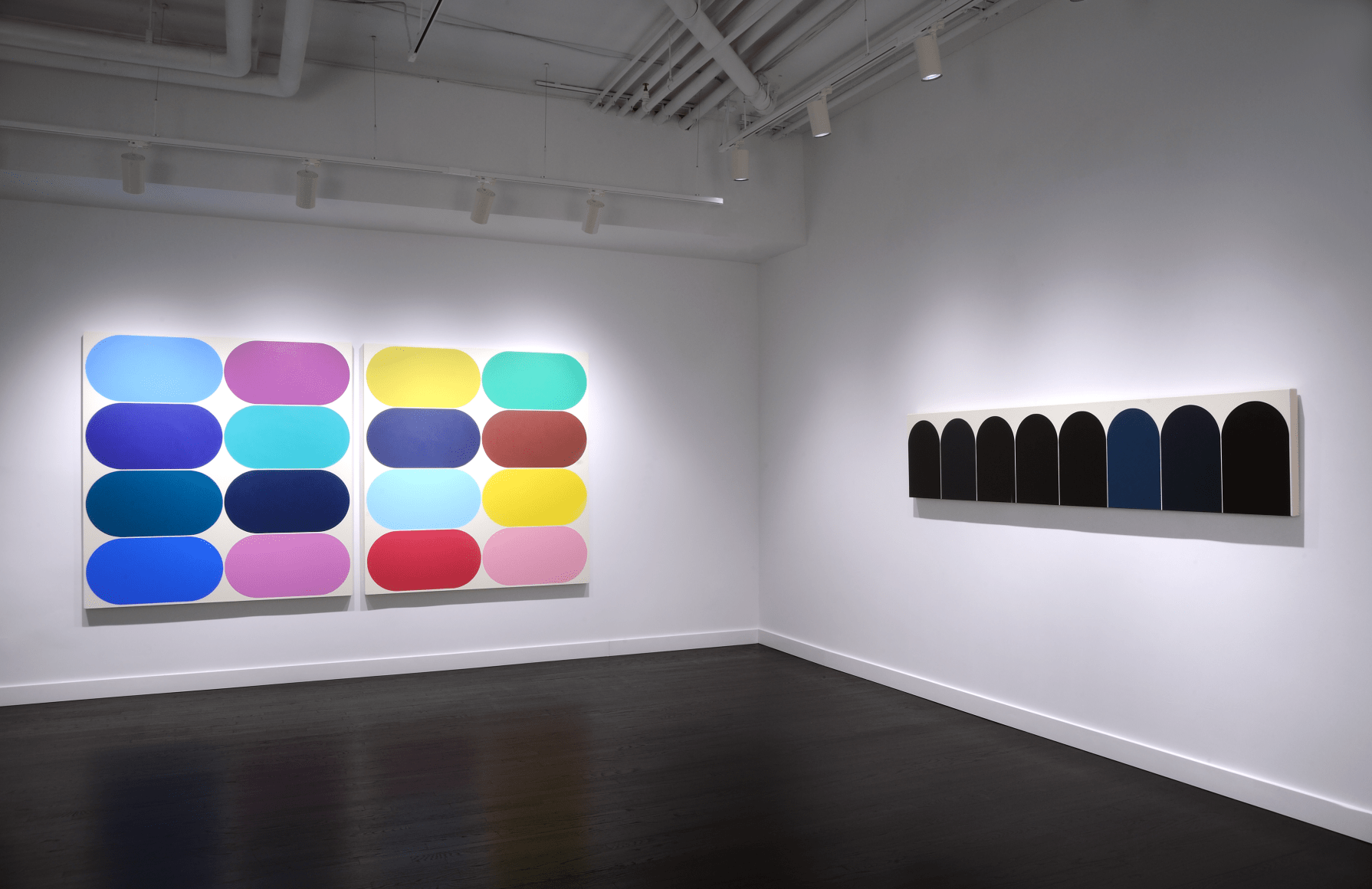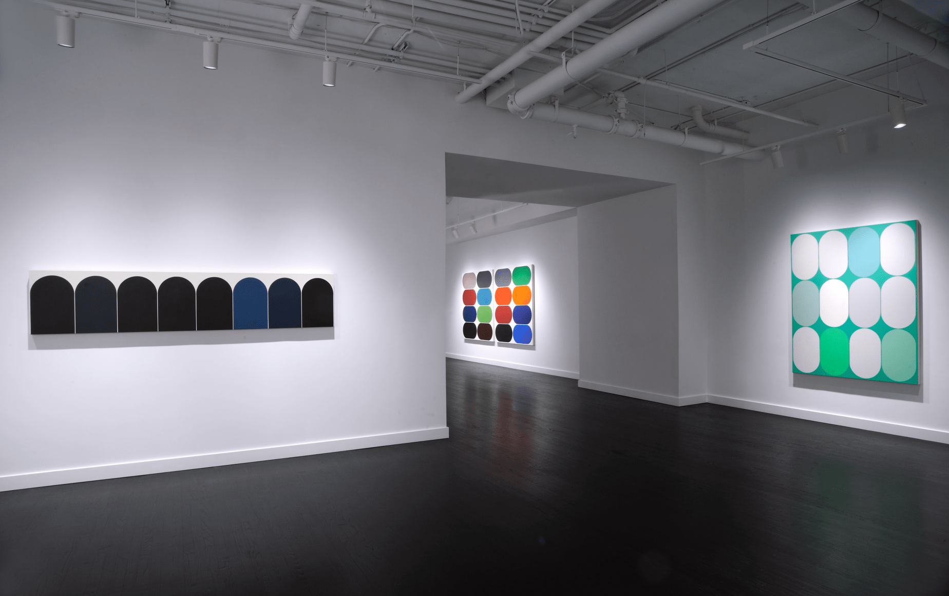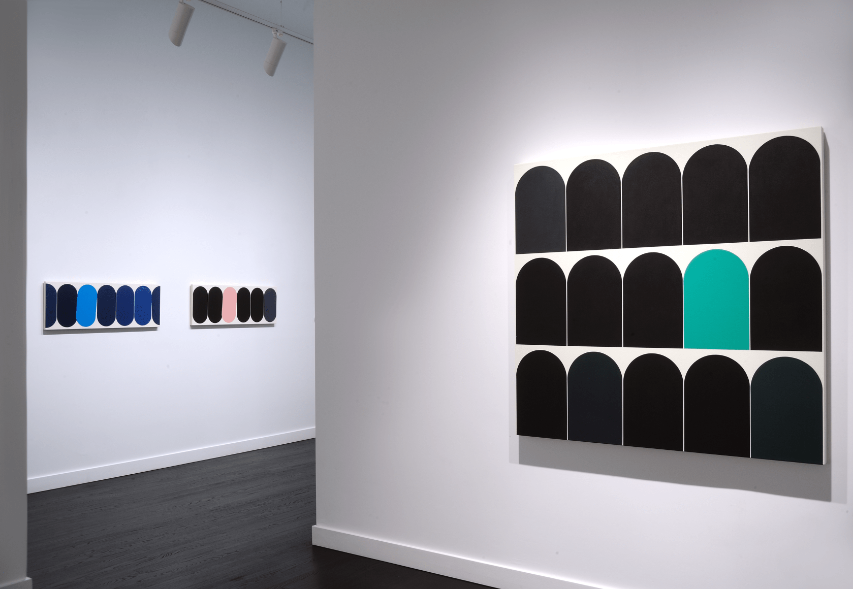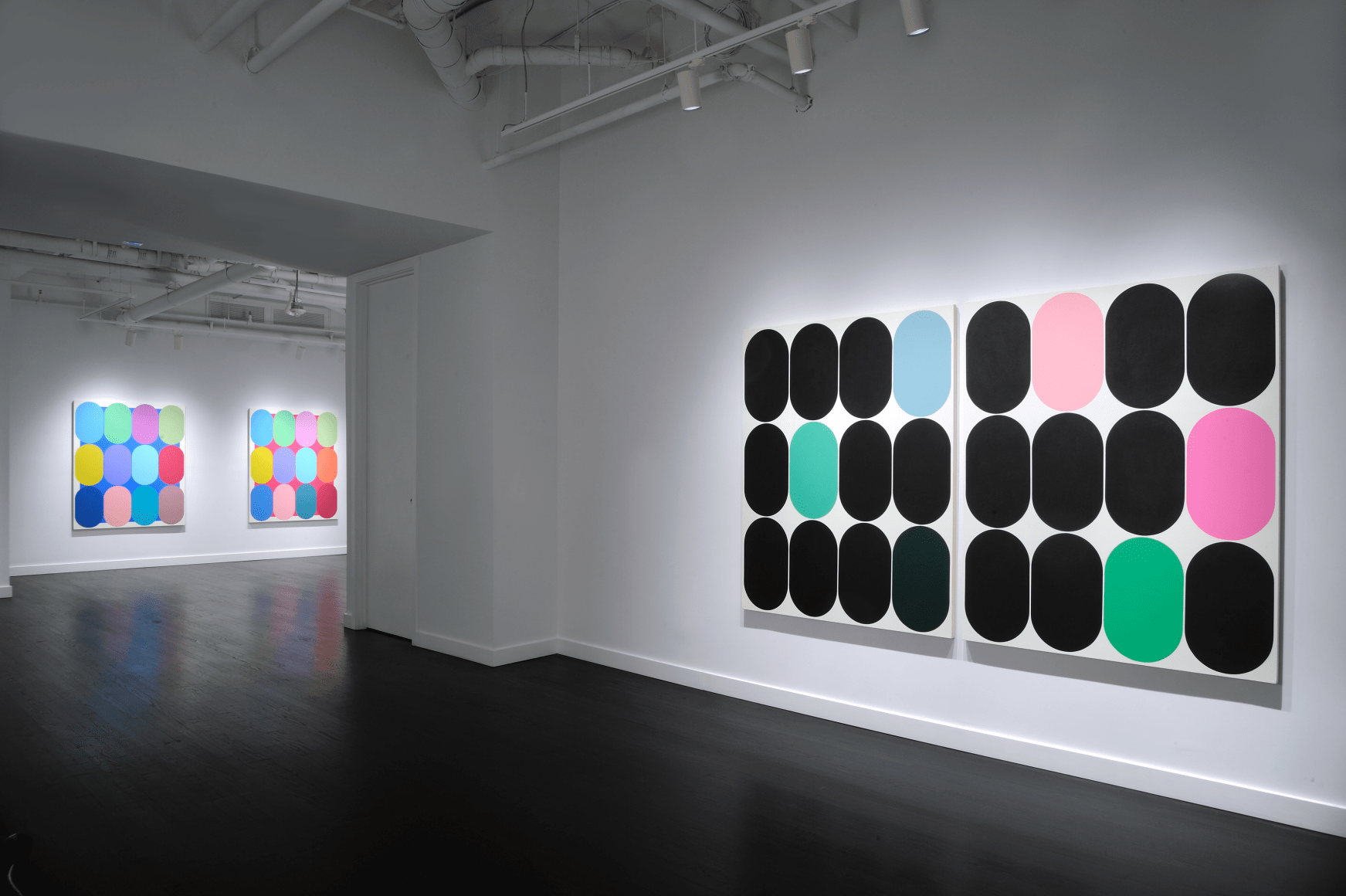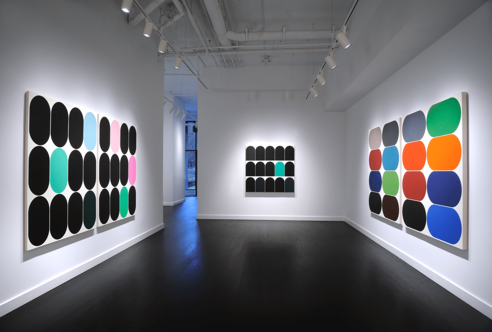 Yi presents a basic unit or form inspired by daily life, urban space, and the natural landscape. The Eq. or Equilibrium Series explores the function of a single defined shape, deployed by the artist in marching arrangements where a grid of like forms is punctuated by contrasting colors. Yi has described this shape as a racetrack, and it appears as a capsule, neither flat nor three-dimensional. The elongated oval creates a sense of speed, suggesting an entity in constant motion, circles straining against their borders to fill all available space on the canvas.