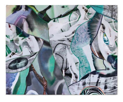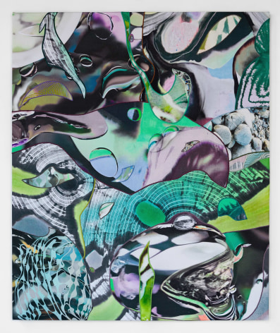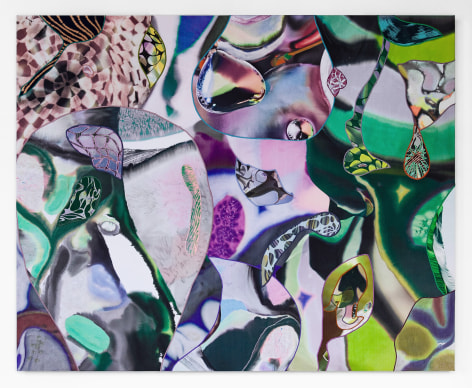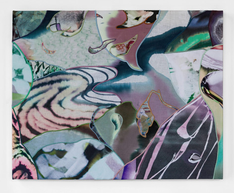 Sophia Belkin’s lush and verdant paintings implore the viewer to look closely at the artist’s material exploration and references to nature that are direct and abstract. Collaged from fabric that is stained, dyed and digitally printed, the various components of the paintings are joined with embroidered seams that mimic the veining on the underside of a magnolia leaf. Belkin’s studio is filled with remnants of stained fabric from a past life that becomes repurposed through her practice. Small pieces of screenprinted aquamarine denim repopulate throughout different paintings, like cells multiplying and growing across surfaces. Organic motifs flow over the surface of the paintings like water radiating out from a skipping stone, disrupted only by the occasional miniature image of a moment in Belkin’s day: a TV remote, flower from the garden, or New Orleans artifact may appear, making for a viewing experience akin to a curious I Spy book as the artist melds two worlds effortlessly.