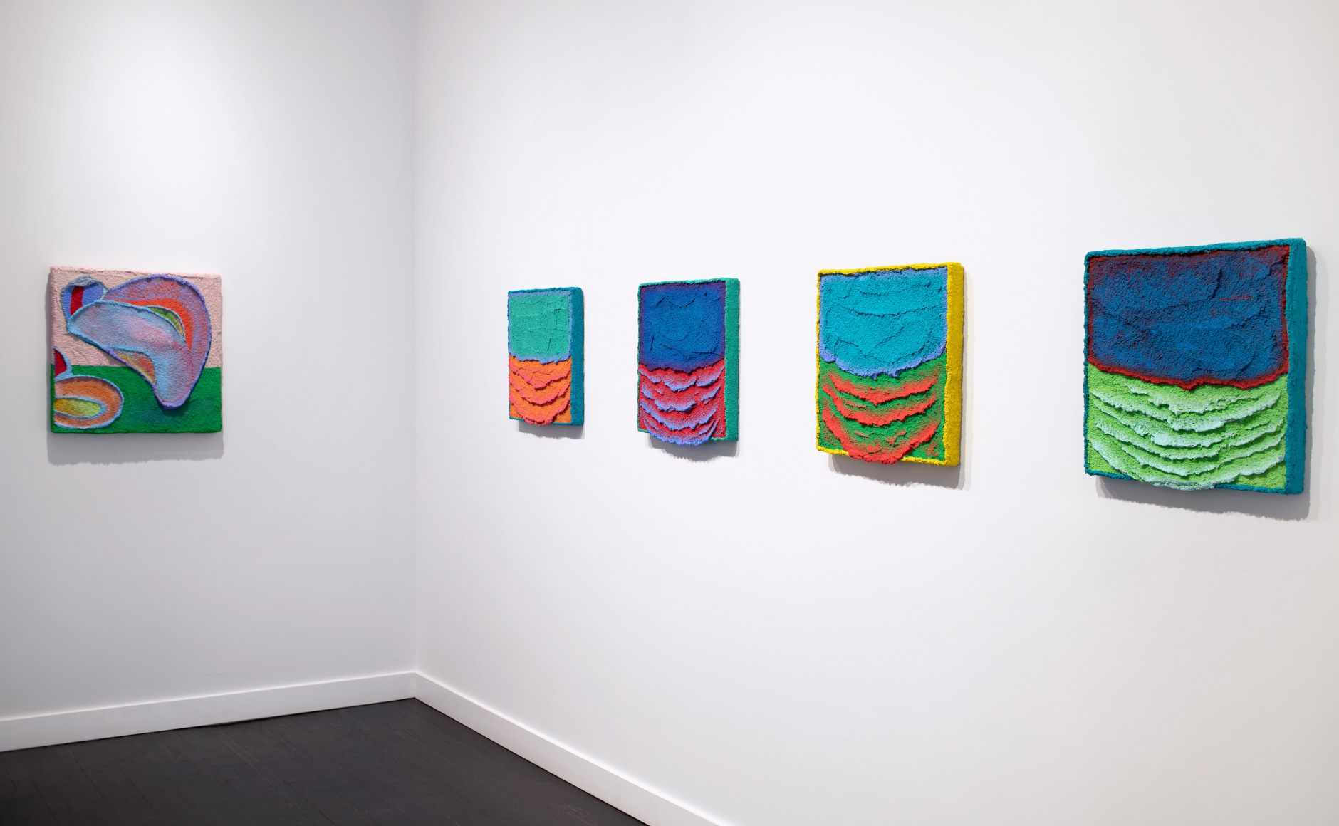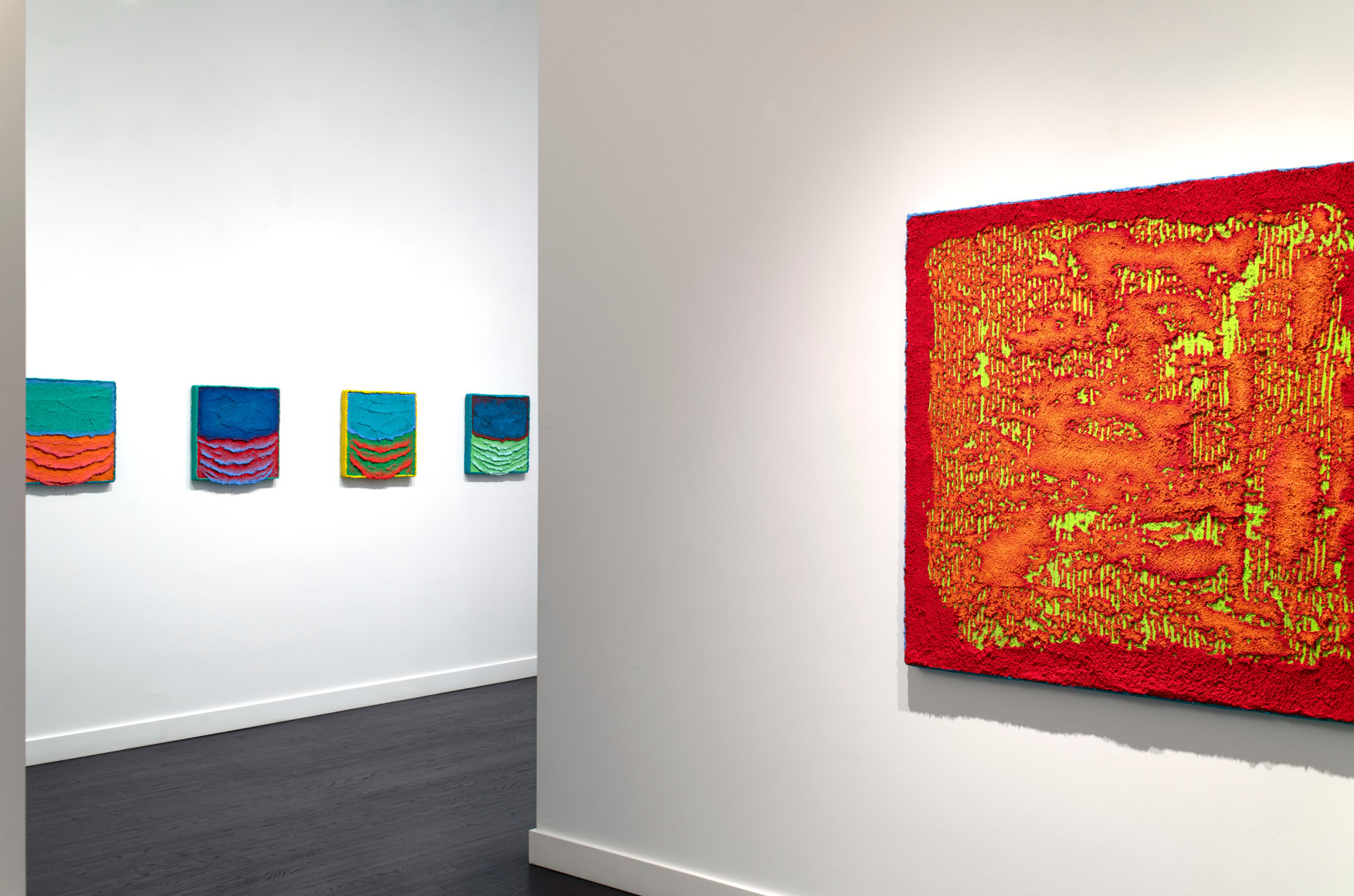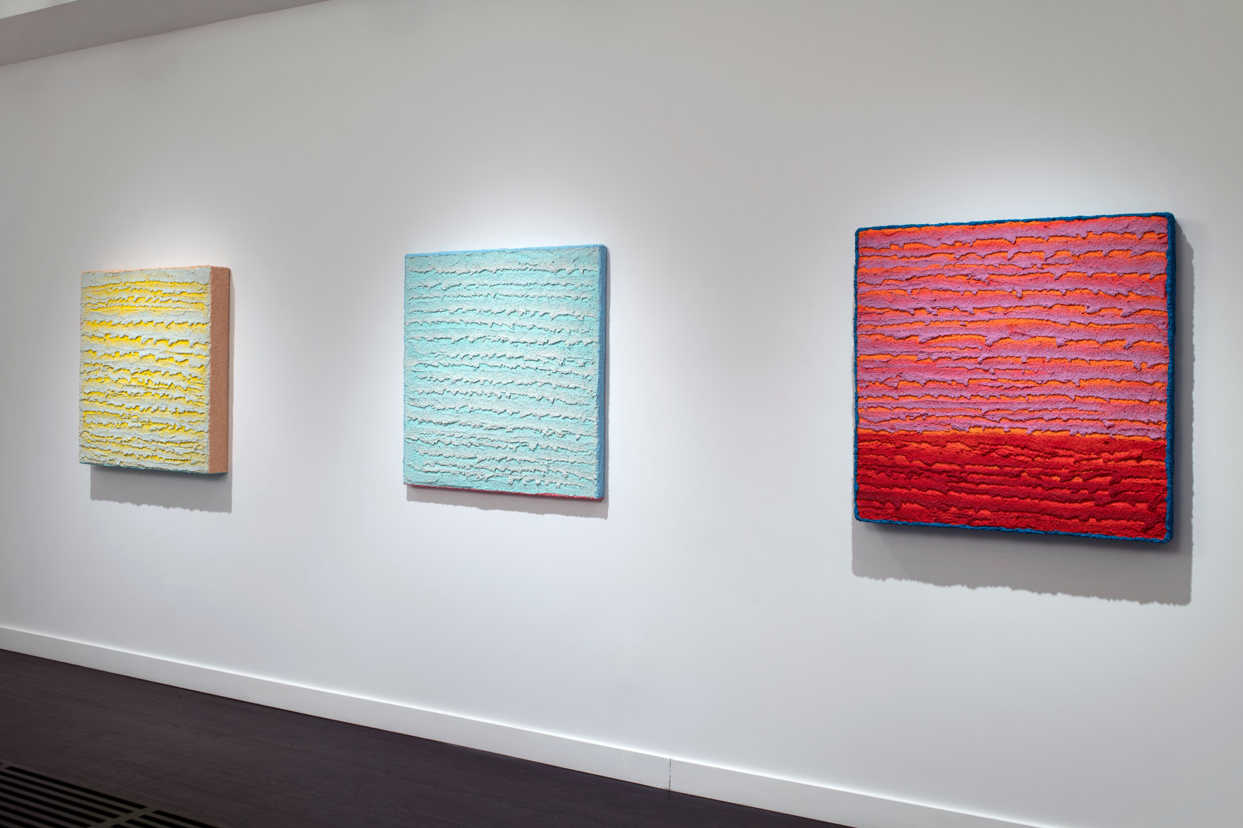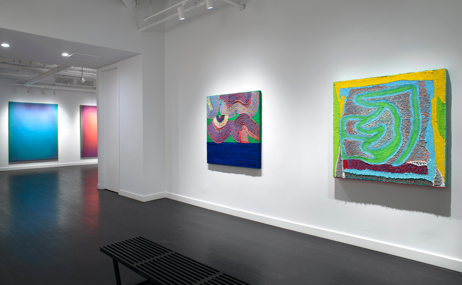 Painters intuitively start with ideas about color. Less obvious and equally as important are the various reductive or additive strategies the artists apply. No prior subject is referenced, no personal content shared, and there is nothing to interpret, only the painting's physical presence exists. Each artist develops a unique method for the creation of works that reduces painting to the purest retinal experience. Leon Berkowitz mastered translucent, unbound areas of color without any traces of brushwork, allowing the viewer to look into color, not at color. The luminous paintings read like ethereal portals into other, softer worlds. Wayson R. Jones is attuned to the quality of surfaces, using a process of building up layers of textured pumice gel in which paint is integrated. The rock-like paintings burst off the wall, enhancing their sculptural appearance. The exuberant works explore color and surface in the opposite way than Berkowitz, adding more and more to the surface until Jones is content with the final object, cascading, neon pumice stone draping over the edge of a square, uniform panel. The two painters embody two extremes of isolating color – Berkowitz creating a disappearing halo of color and Jones lavishing material to a three-dimensional explosion.