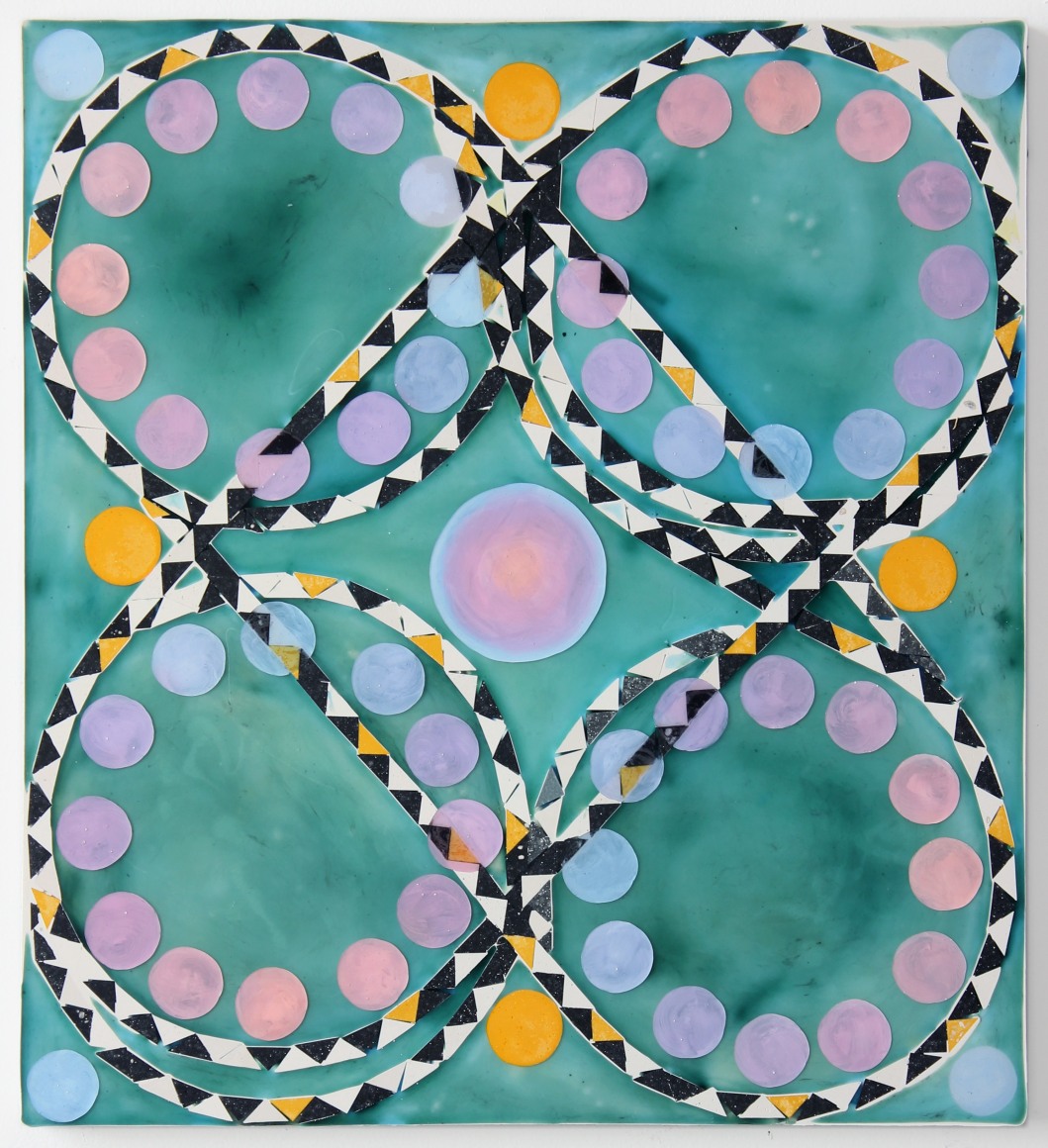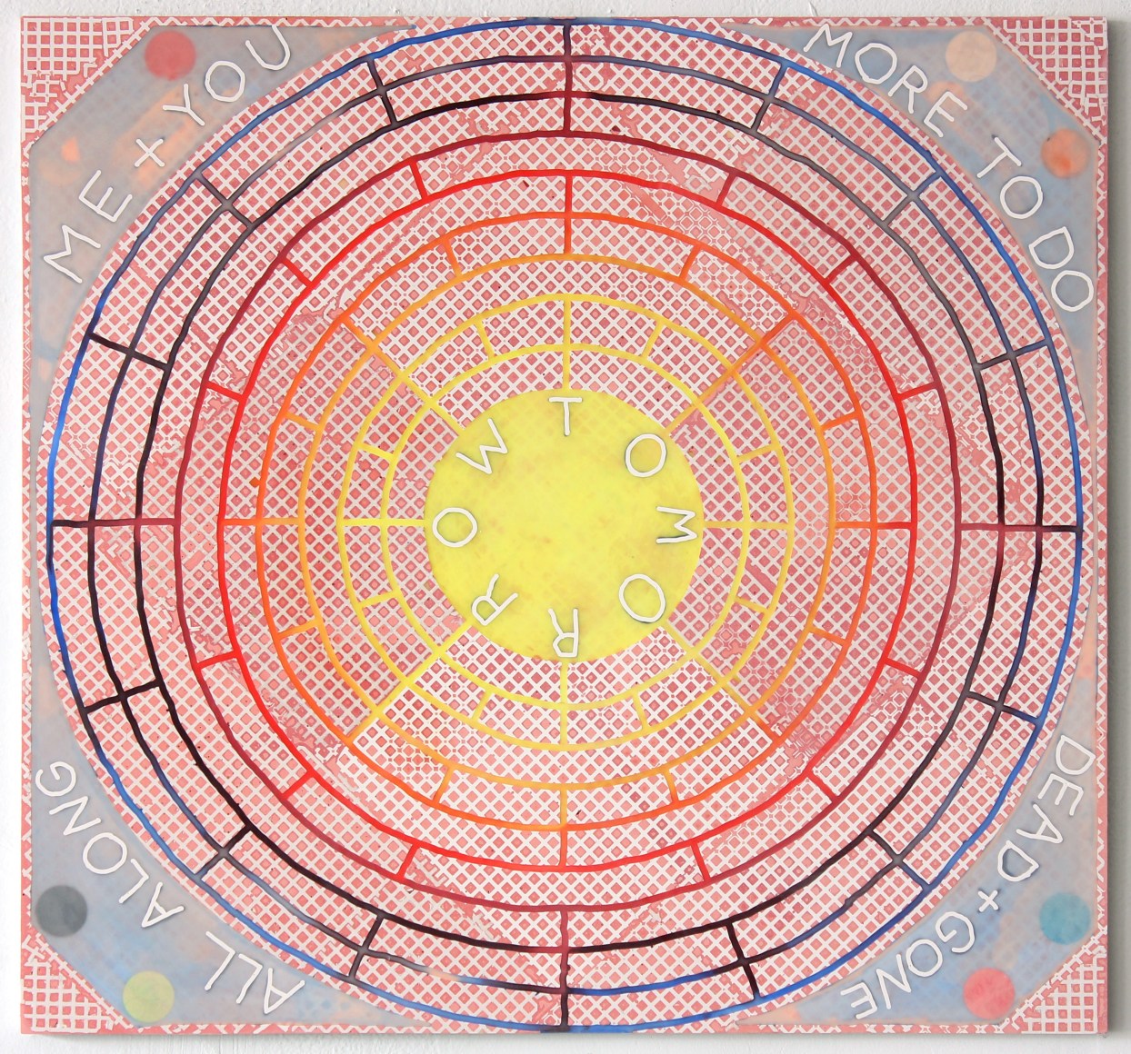 E.E. Ikeler’s paintings are a pathway to knowledge that appeals to the senses. Pieced together with various materials and abstracted in their structure, the work's initial reading is welcoming and colorful. Initially organized by the grid, the images are twisted with patterns presenting a secondary piece of information revealed through language. The scripted messages are intended to fill in the void of communication that abstract painting leaves behind. The artist has called them “fake protest signs” while at the same time recognizing the shortcomings of an actionable protest. The work brings cohesion to daily conundrums, fragmenting experience and perspective through process.