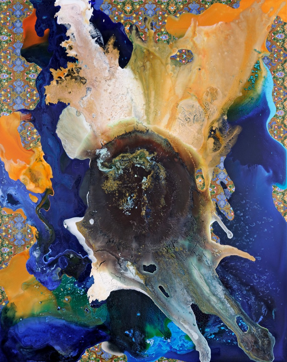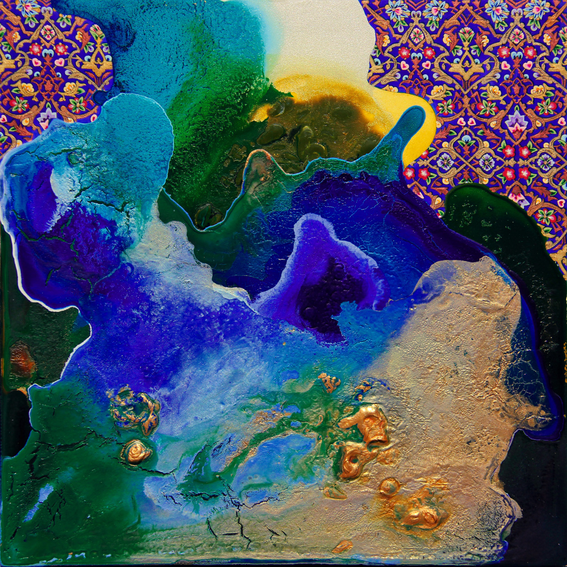Moving to an aerial view, observing from a distance, there may be no such thing as a cultural war. There may only be a process, a moment in an ever-evolving world of cultural forces. Although this viewpoint does not champion good or evil, it does acknowledge movement and outcome. The paintings of Hedieh Javanshir Ilchi arise from cultures often portrayed at war. Each culture measures itself by a different clock. Each respective clock sometimes runs faster than the other, then slower, sometimes backward and then again forward. The clocks rarely synchronize, until the conflicts are spent and the two clocks merge. Ilchi’s work takes us to an aerial viewpoint where we see traditional Persian imagery merging with modernist American painting techniques. The content is not in conflict, but there is sense of broken parts coming together and things from a past appearing in a present. Contrary to our times, where a speeding flow of expedient information engulfs everything, Ilchi asks us to step back, slow down, take the aerial view. From this vantage point we see intricately executed tazhib patterns, sometimes floating over and at other times captured within scenes of organic chaos. Chaos created by the layering of translucencies, controlled pours and the topographical accumulations of paint. It is as though we are witnessing the reactions of chemical components. It takes time to comprehend the dazzling luminosities of her paintings, to see the merging of two cultures. Yet Ilchi’s work is not of an ideal state, there is a sense of trouble in her pictures, an apprehension of beauty, and a pining wishful-ness for the outcomes we are moving towards.