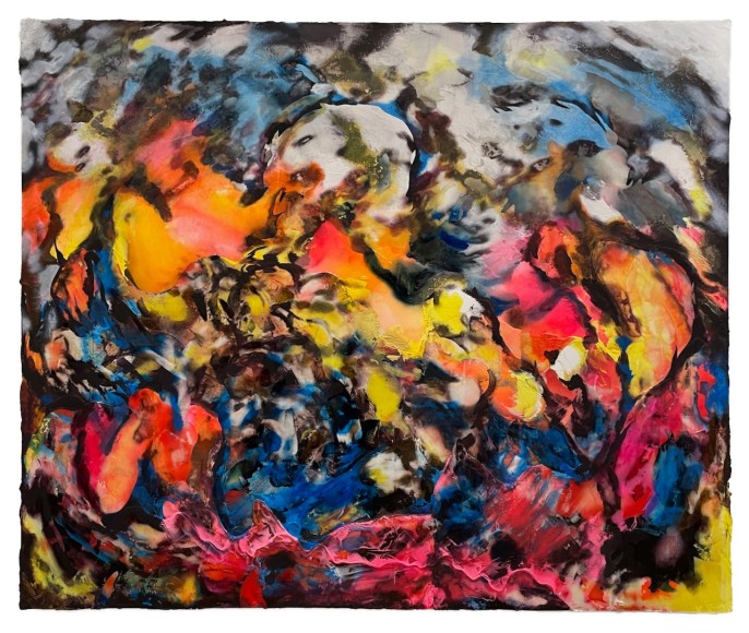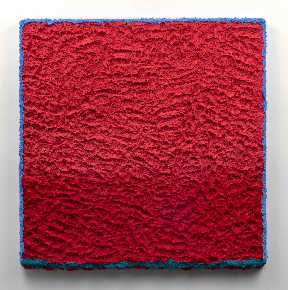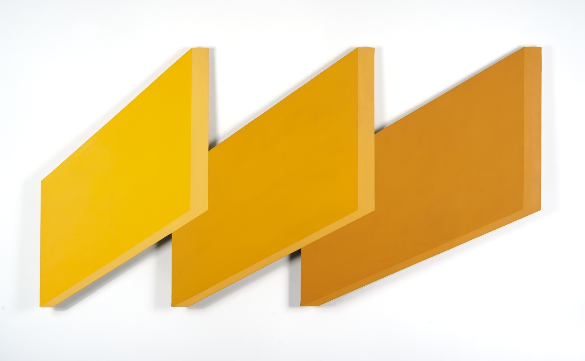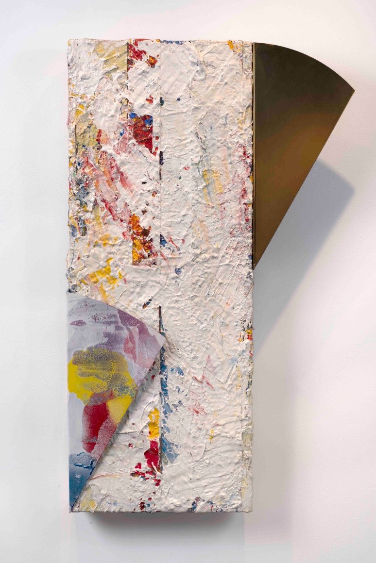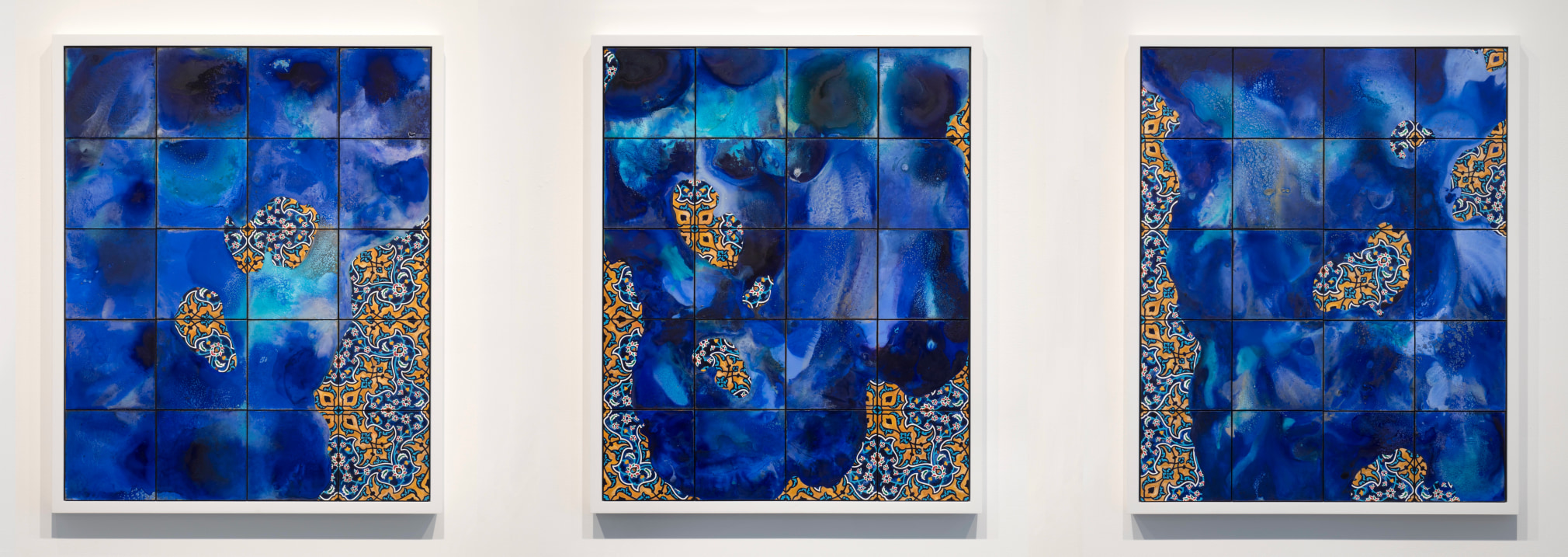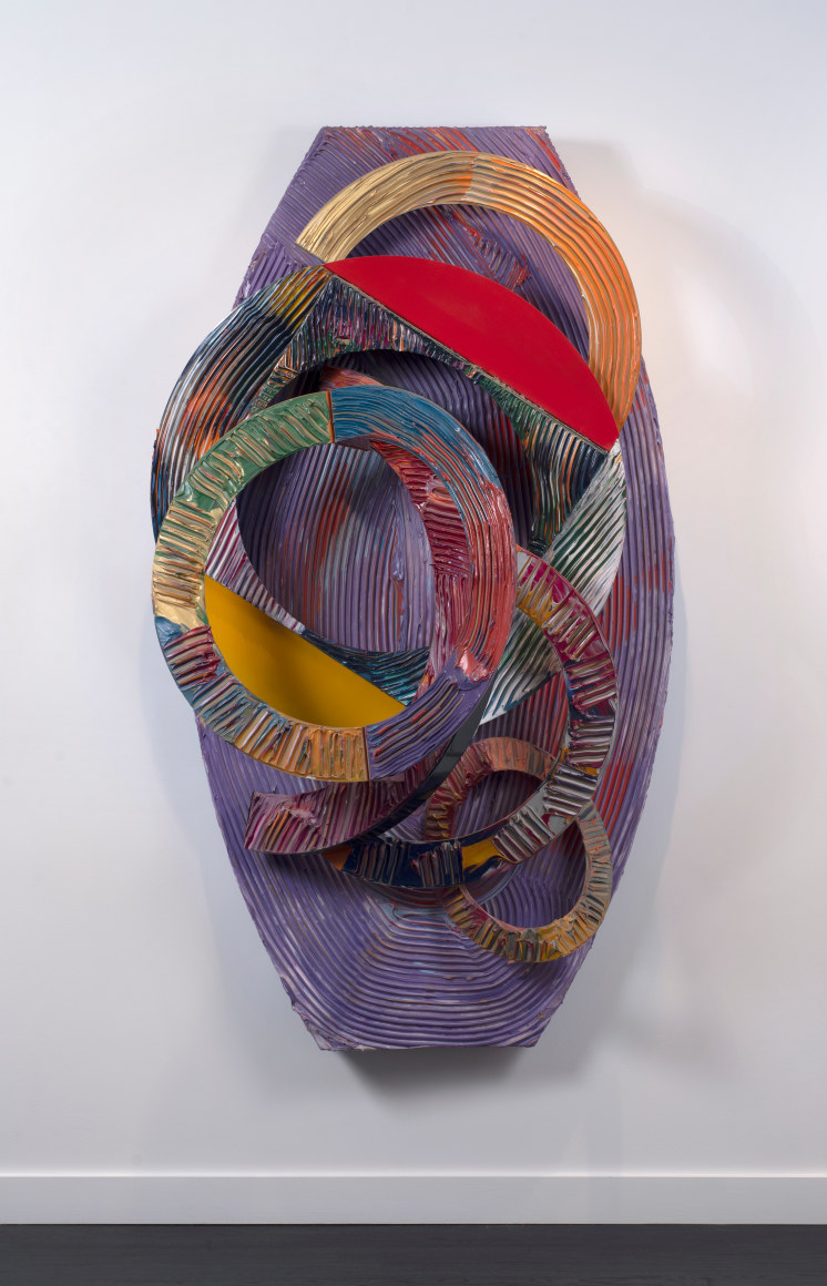 Jump, Twist, Flow… invites summer through vivid colors and dramatic pieces that radiate from the walls. As you venture into the exhibition, deep, eye catching tones from Hedieh Javanshir Ilchi’s tile triptych, Untitled, draw you closer to intricate Tazhib designs which overlay paint pours. Weaving through the gallery, physically engaging pieces erupt forward into your line of sight. Sam Gilliam’s Mirrors, utilizes acrylic paint in a unique fashion, thick smears of color coating the surface with shifting metal armatures tilting forward. Lisa Scheer’s sturdy and angular sculpture, Leviathan looms from the wall, also unique, appearing weightless and substantial simultaneously. With sculptures and paintings bursting from the walls, jutting into the room and rich colors enticing closer inspection, Jump, Twist, Flow… urges the viewer to swirl, flow, and bob through the gallery, like a child in a swimming pool.