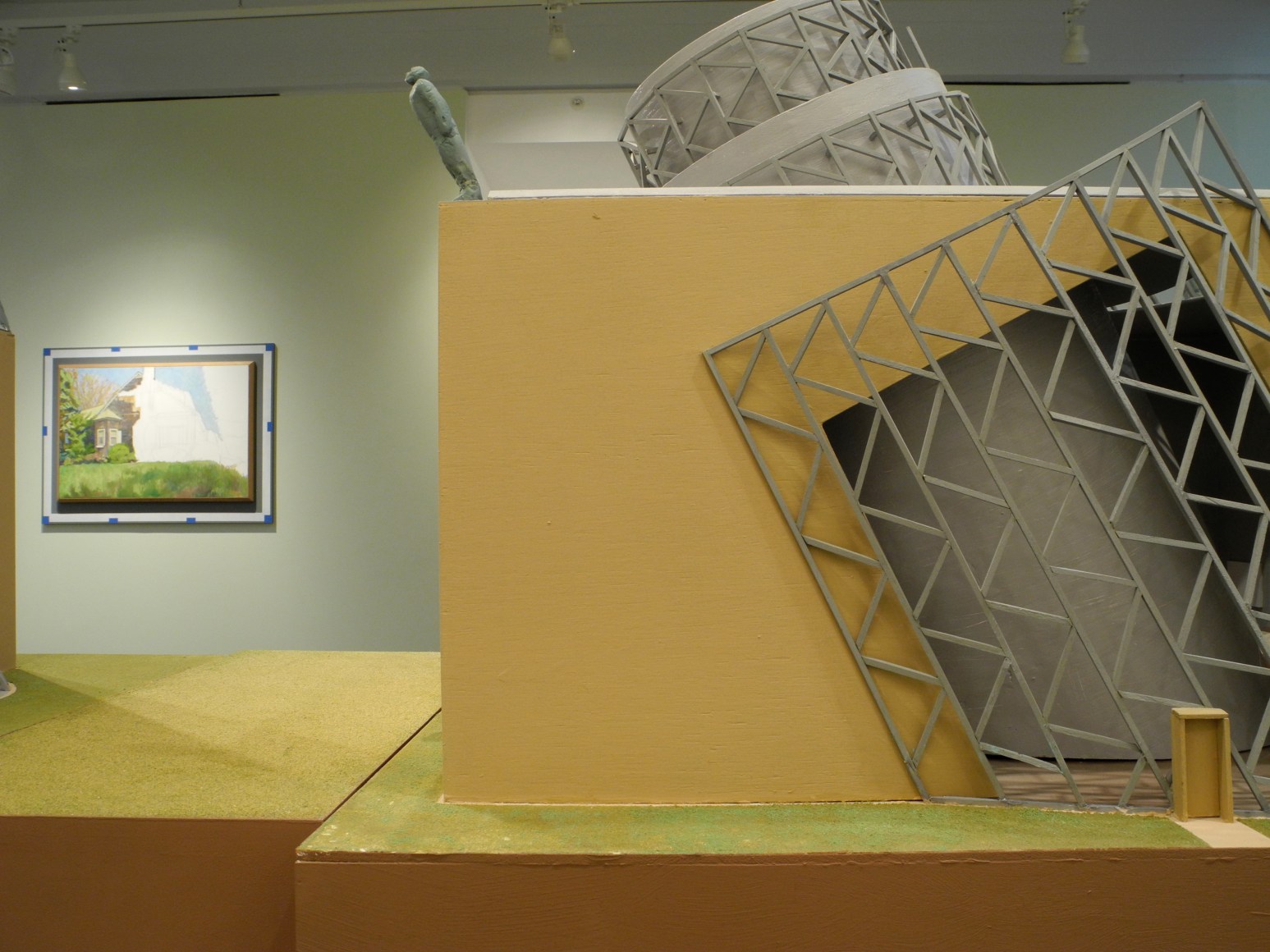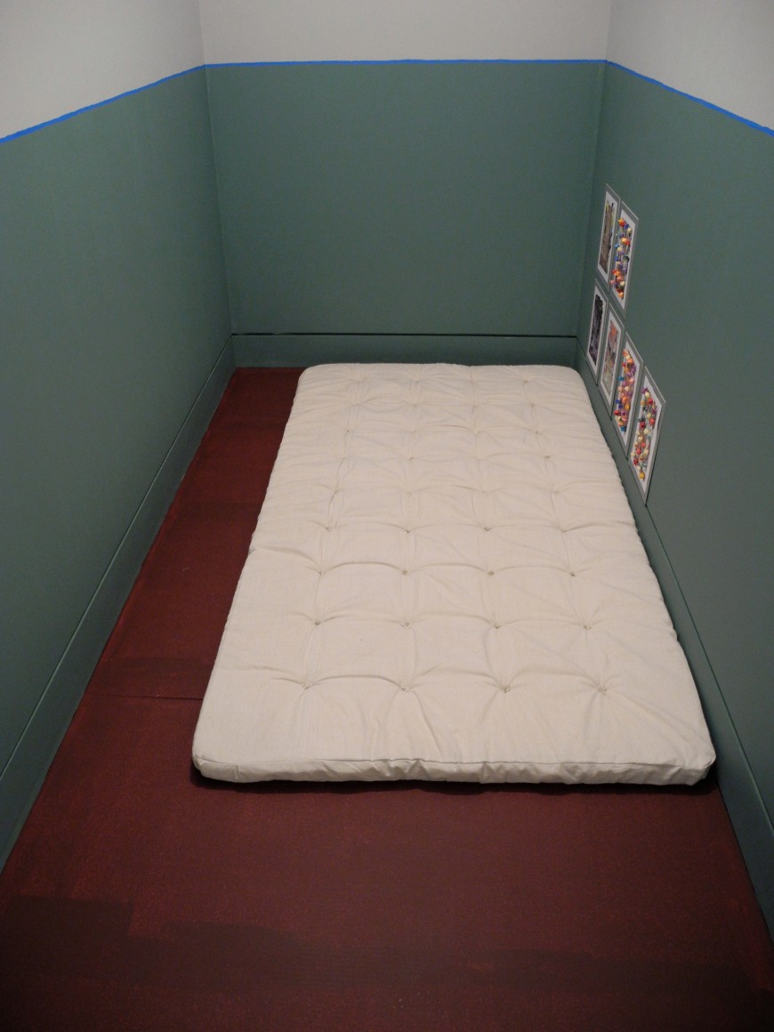"The exhibition features pleasant drawings and simple messages, as well as a nook with a mattress where a child might curl up to nap, watched over by 3D illustrations mounted low on the wall."