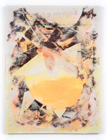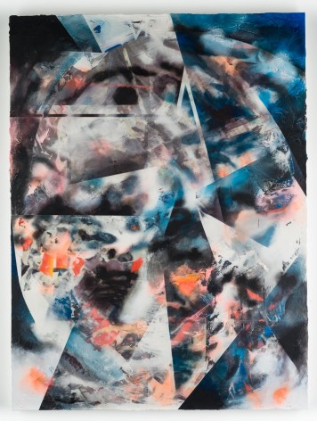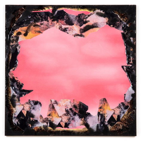 Rushern Baker IV seeks to capture the frenetic energy created by today’s socio-political malaise. This energy manifests itself in his paintings through layers of digital collage, resin, ceramic tile adhesive and paint. The various media are interwoven, at odds, and chaotic, slowly revealing compositions of destruction. There are hints of collapsing columns, drones shot down from the sky, Soviet propaganda posters, comic books, fallen structures, fire, rocks, and finally, ash. At times, Baker delivers a break in the rubble, leaving us with a moment to exhale, observe and ask, “is this the beginning or the end?”