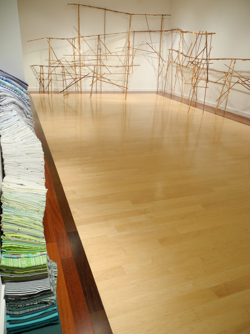 Space is the Place invites two artists working in the field of installation to create new works responding to Carroll Square Gallery’s architecture and environment. Mariah Anne Johnson and John Watson negotiated the use and allocation of the gallery space for their individual projects. Each artist’s characteristic mode of operation is evidenced in his or her use of the space. Johnson’s folded fabrics grow in undulating forms along the wall. Watson’s construction builds from the floor into a complex labyrinth of reclaimed wood. Together their works create a charged environment for visitors to view and experience.