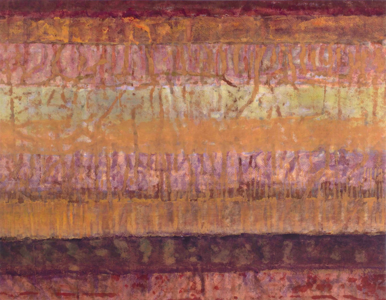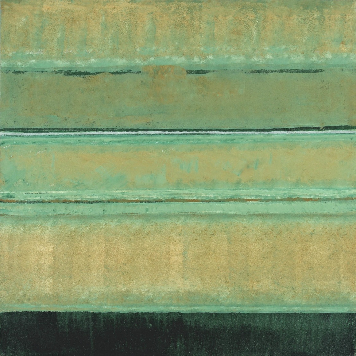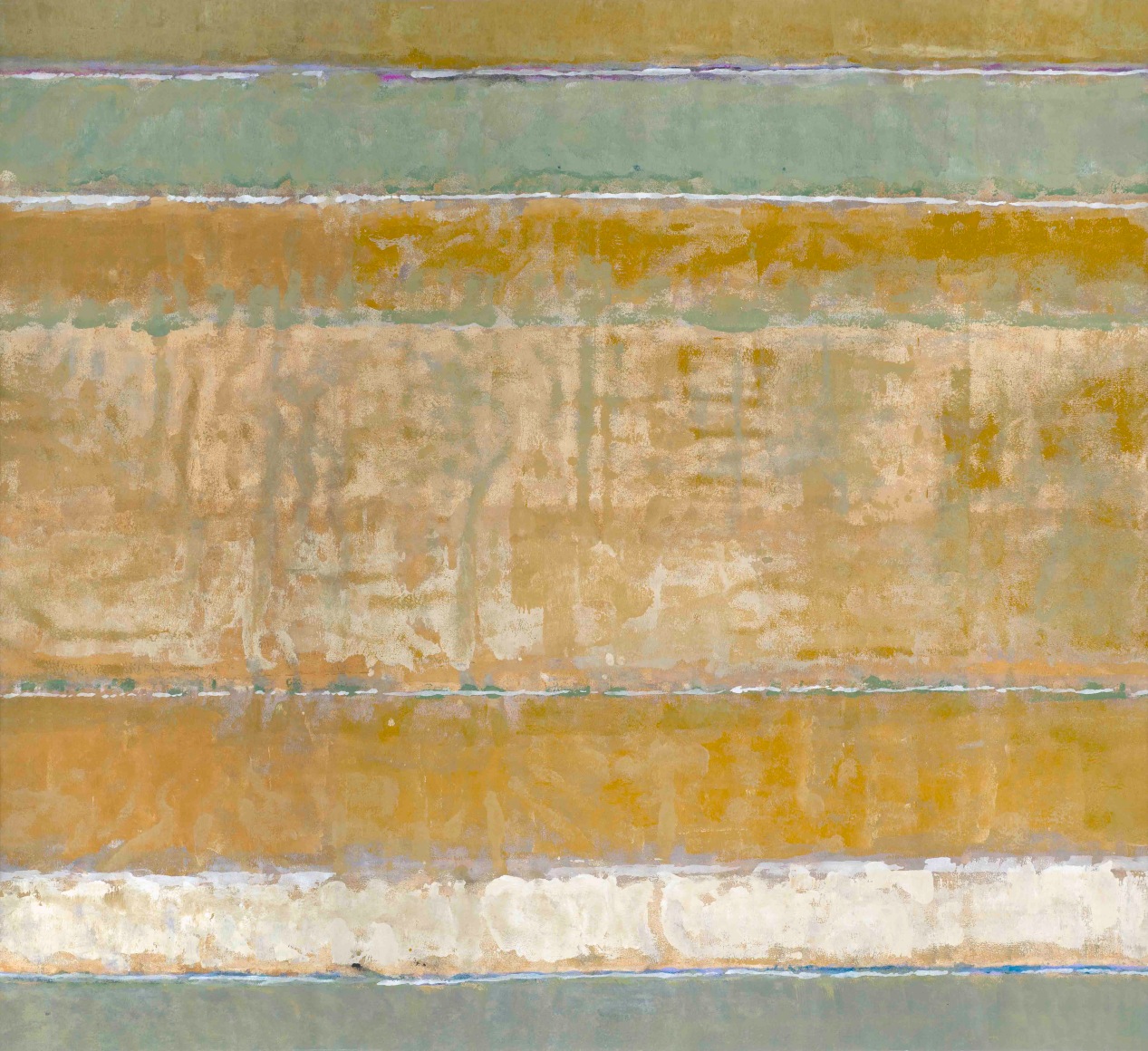 In 1973, after de Looper’s initial recognition and success, he and his wife Frauke made a long-anticipated trip across the United States. For east coasters of European origins, the deserts and mountains of the American Southwest were a revelation. Upon Willem's return to DC, he limited his color palette. He began applying paint with various paint rollers, developing a motif of horizontal bands of layered colors, adhering to staining with acrylic paint into un-primed canvas. Generally, de Looper's second act can be separated between earth tones, foliage and sky colors. The divide between the bands of color points to the drama of the sometimes severe, and other times the nearly indistinguishable boundaries within nature. De Looper can be applauded for extending the content of the Color School by holding back from illustrating the visual experience of desert and sky while creating parallel experiences reminiscent of his and Frauke's revelations in the American Southwest. Most of his paintings from 1973 to 1976 are larger than those from the previous period. Anyone experiencing the grandeur of the canyons, deserts, and mountains of the Southwest for the first time feels a shift in their perception of scale. Undoubtedly, this pushed the artist to build larger work for a more overwhelming experience.