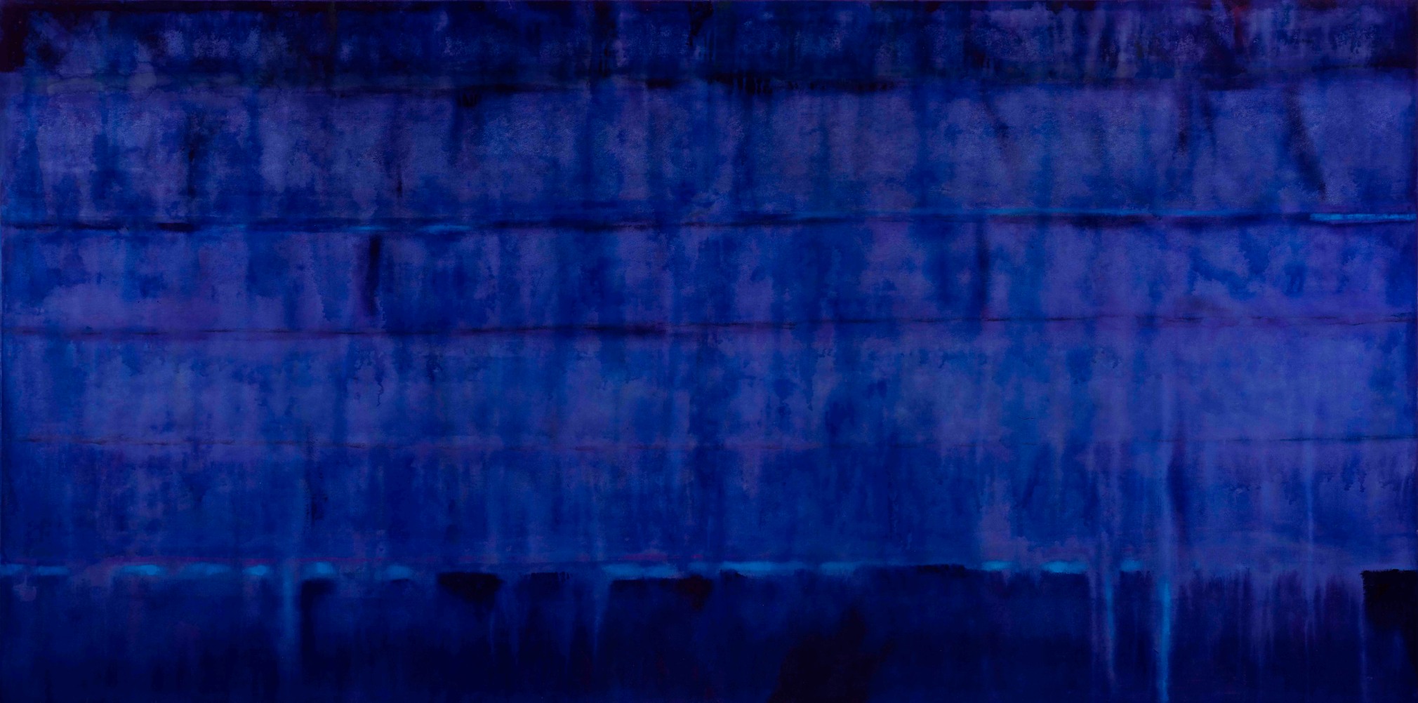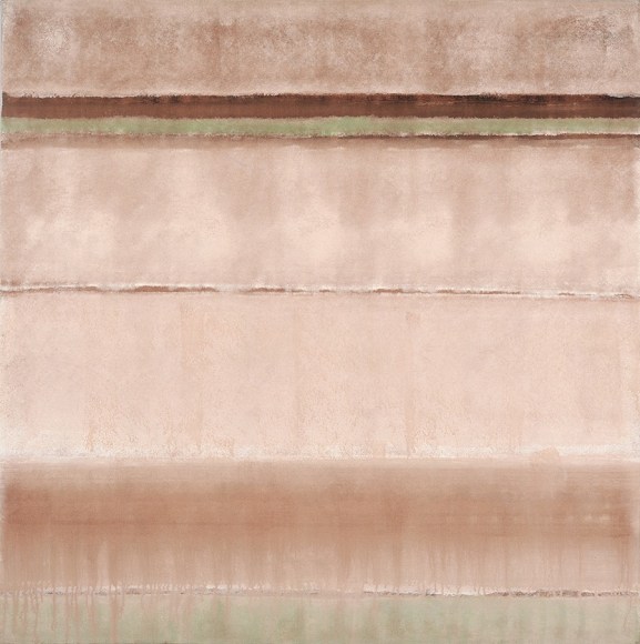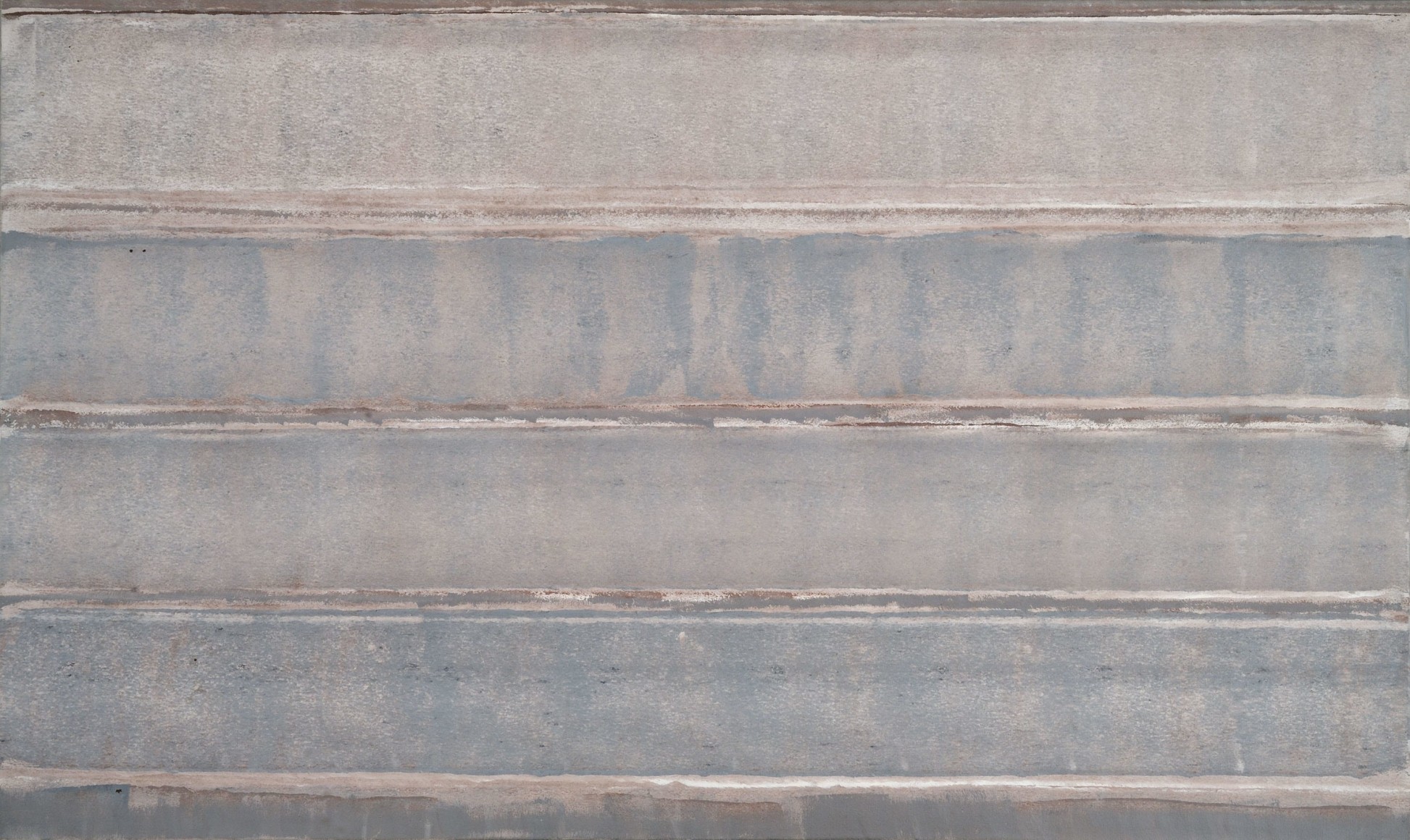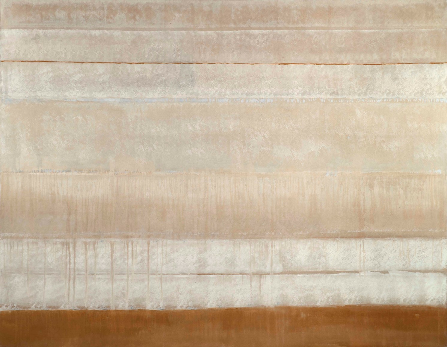 In 1973, after de Looper’s initial recognition and success, he and his wife Frauke made a long-anticipated trip across the United States. For east coasters of European origins, the deserts and mountains of the American Southwest were a revelation. Upon Willem's return to DC, he limited his color palette. He began applying paint with various paint rollers, developing a motif of horizontal bands of layered colors, adhering to staining with acrylic paint into un-primed canvas. Generally, de Looper's second act can be separated between earth tones, foliage and sky colors. The divide between the bands of color points to the drama of the sometimes severe, and other times the nearly indistinguishable boundaries within nature. De Looper can be applauded for extending the content of the Color School by holding back from illustrating the visual experience of desert and sky while creating parallel experiences reminiscent of his and Frauke's revelations in the American Southwest. Most of his paintings from 1973 to 1976 are larger than those from the previous period. Anyone experiencing the grandeur of the canyons, deserts, and mountains of the Southwest for the first time feels a shift in their perception of scale. Undoubtedly, this pushed the artist to build larger work for a more overwhelming experience.